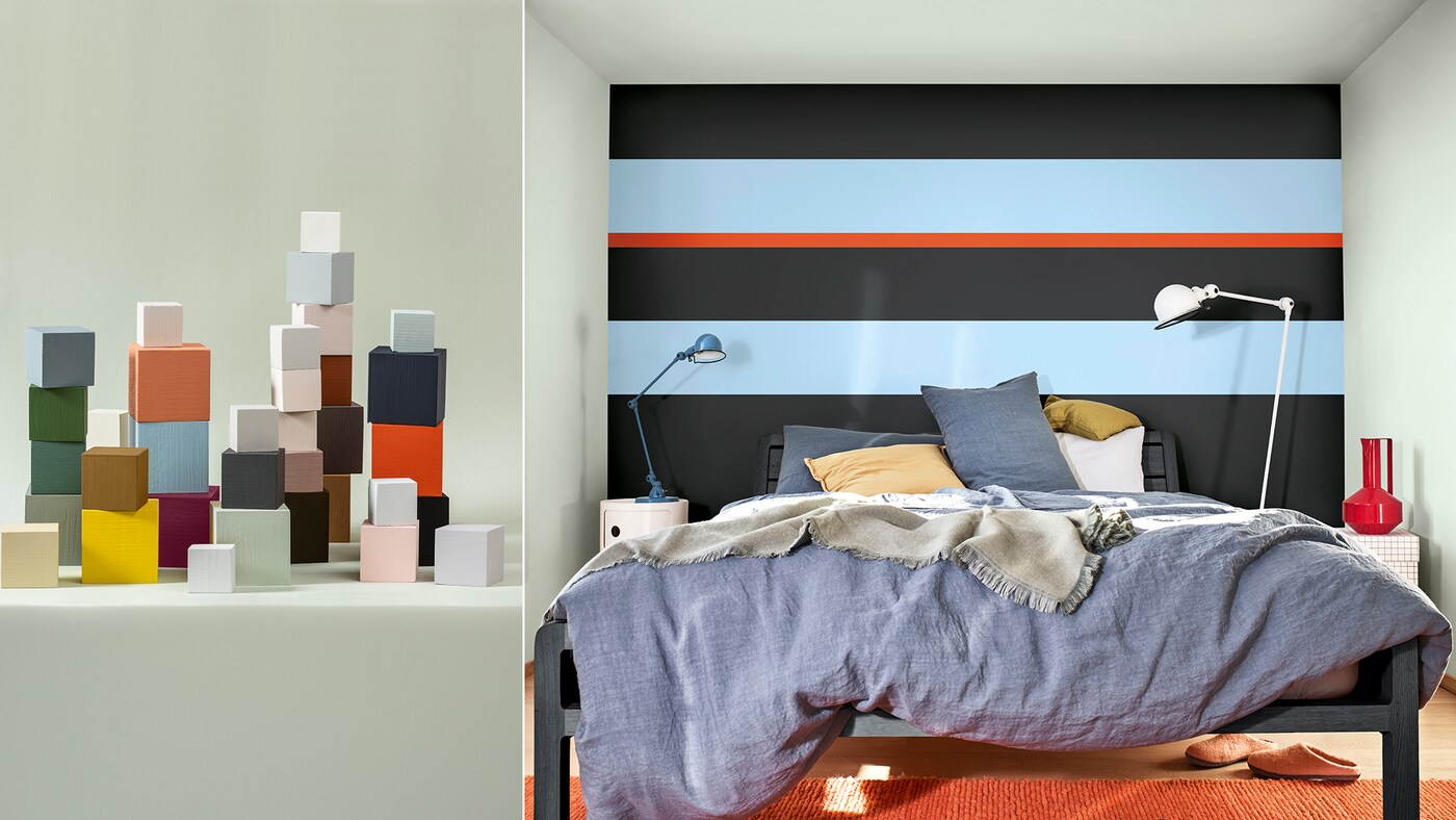 Med hjälp av kulörstarka ränder på väggen så skapar ni en personlig och unik vägg i sovrummet. Här har vi valt att måla en fondvägg bakom sängen med lite mörkare och mer vågade kulörer. Tranquil Dawn som är målad på sidoväggarna samt i taket harmoniserar vackert till fondväggens palett.