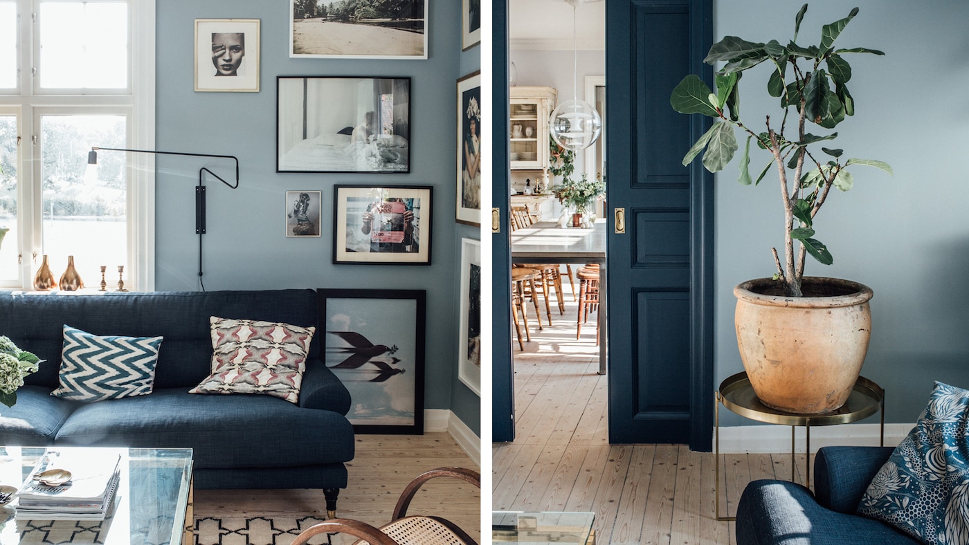 – Min lokala Nordsjö butik hjälpte mig att blanda fram två alternativ som jag sedan gick hem och testmålade på väggen för att se hur kulören skulle göra sig i både dagsljus, kvällsljus, bland skuggor, till våra tavlor och våra möbler. Jag ville också att kulören skulle fungera ihop med den storblommiga tapeten i hallen och eftersom det är ett genomgångsrum så ville jag att det skulle vara en vacker passage in till matrummet som är målat med den fantastiskt vackra nästan vita kulören Light Dijon, med de stora mörkt blå skjutdörrarna i kulören Dark Dijon i mellan.