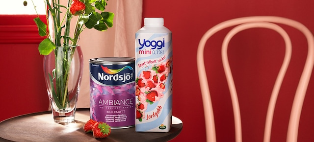 Varje morgon är vi många som sitter över vår skål med yoghurt och njuter av smaken och därför vill vi på både Nordsjö och Yoggi att det även ska vara möjlighet att ha dessa härliga yoghurtkulörer på väggarna i sitt hem. Vad säger du om samoagult i sovrummet eller jordgubbsrött i hallen?