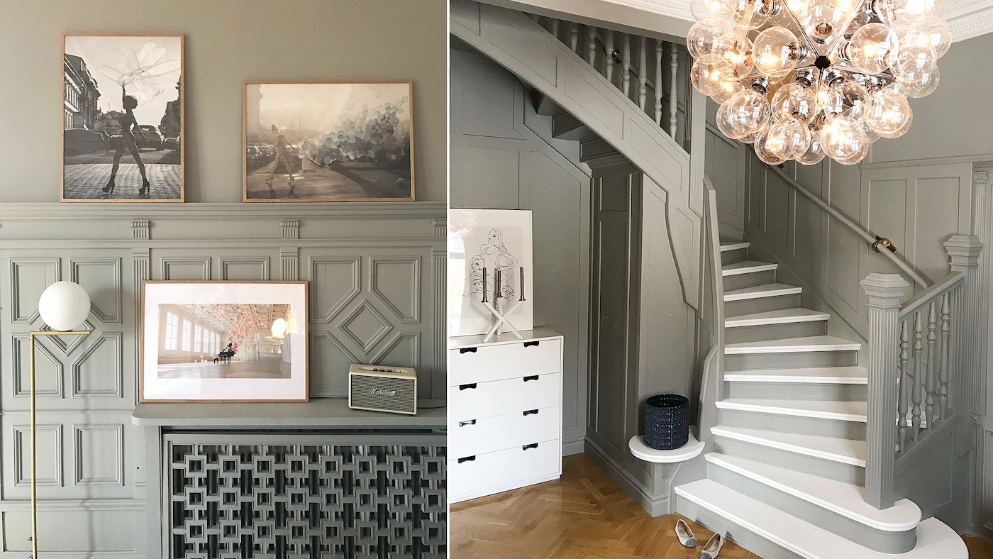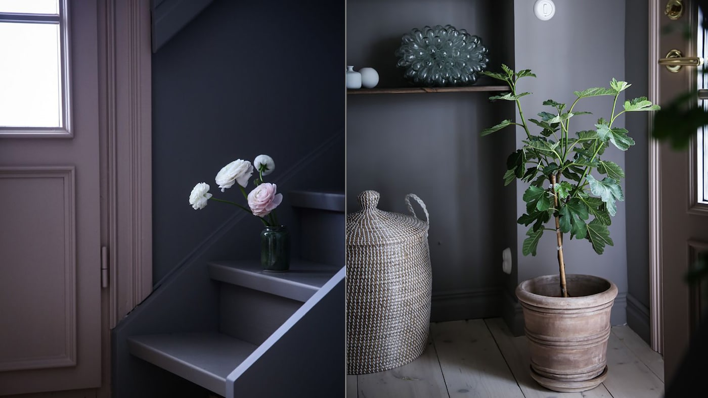 Hemma hos Emily Slotte @emsloo har en tidigare bortglömd yta i hallen fått lite extra kärlek och ny uppmärksamhet med hjälp av lite färg. Den dämpade gyllenrosa kulören på dörren heter Rosengång och väggarna och trappen är målad i kulören Dusky Sarcelles.