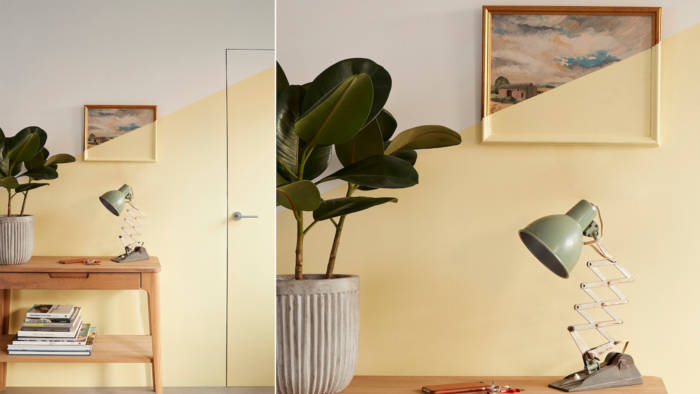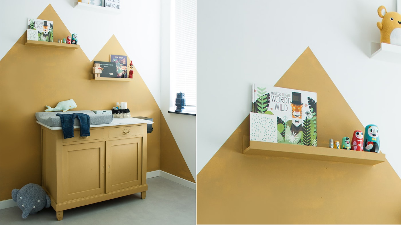 Här har den kreativa bloggaren Shari Pelkmans @sjaartje målat ett mönster på väggen och sedan målat in hyllan och skåpet i samma kulör. Den guldinfluerade ockrakulören heter Ochre Gold - Årets kulör 2016.