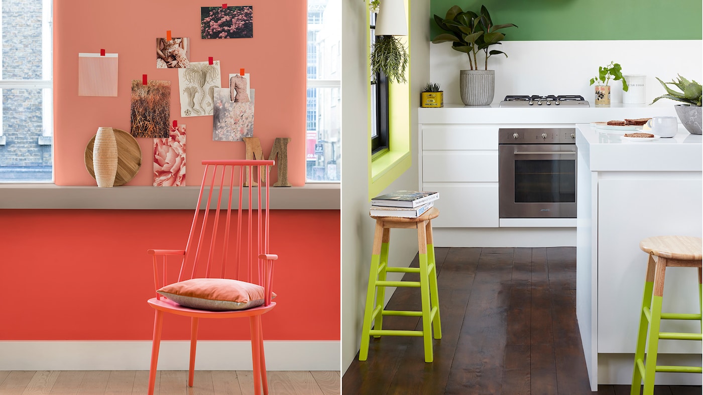 Här har köksstolen och pallarna fått samma kulör som finns på väggarna för att skapa en skön lekfullhet. På bilden till vänster så är stol och nedre del av väggen målad i kulören B1.33.50. Den övre delen är målad med Årets kulör 2015 - Copper Orange.