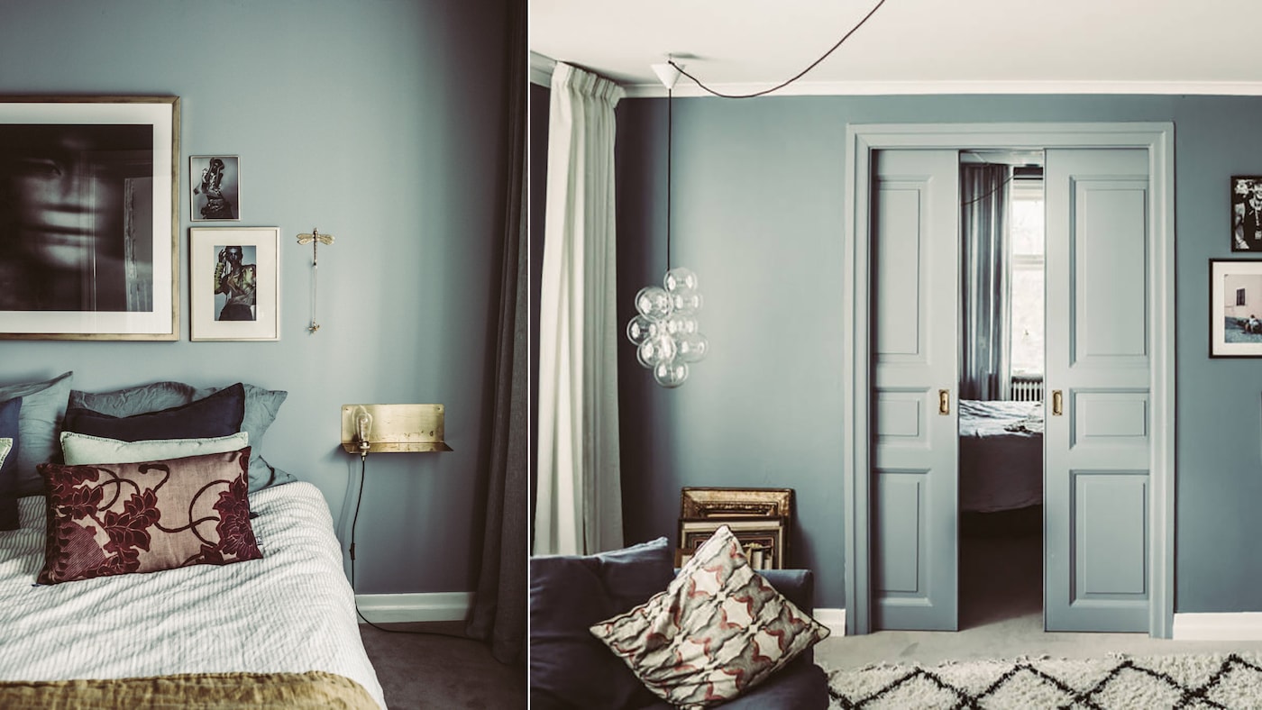 I detta bohem-lyx sovrum som vi hittar hemma hos Kristin Lagerqvist @krickelin så har hyllor och vägg målats med kulören Clear Paris.
