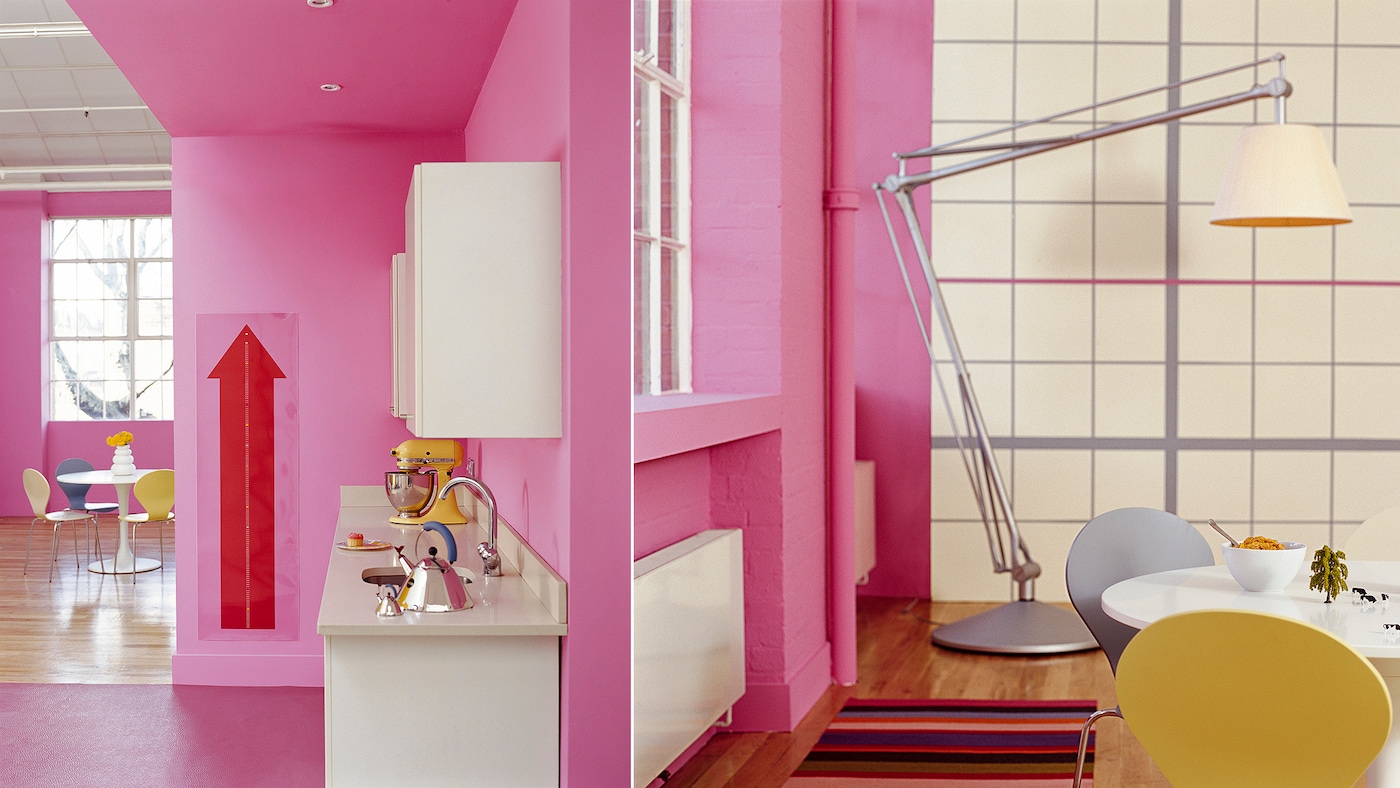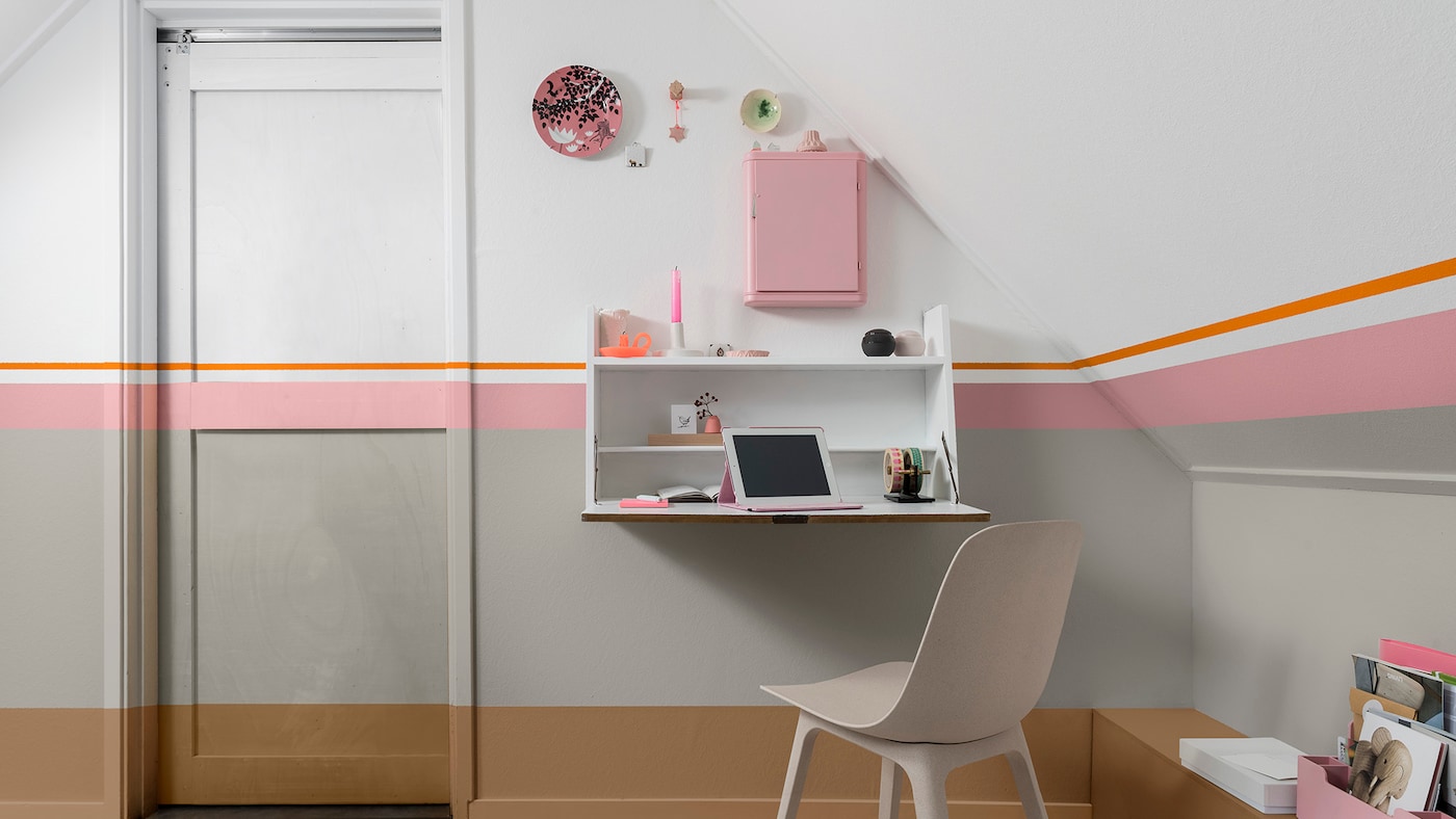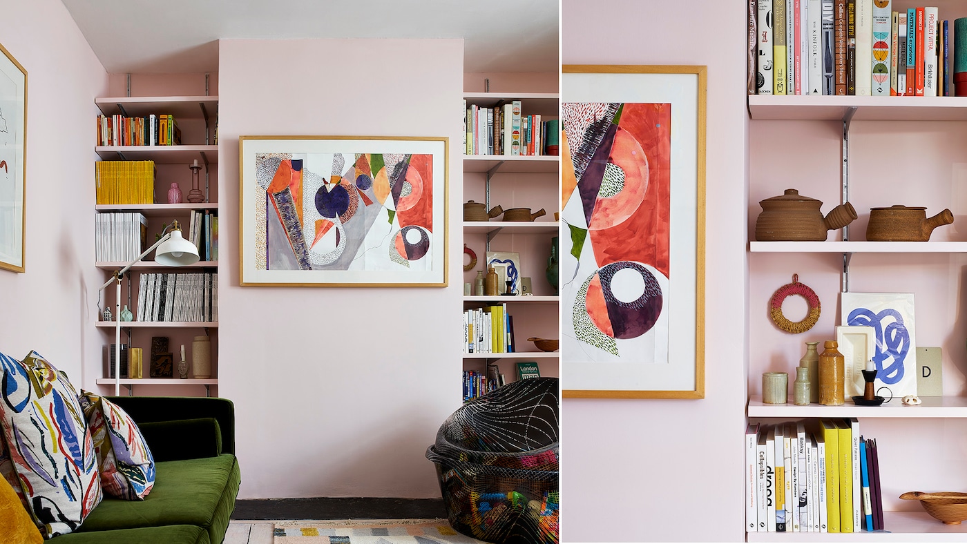 I detta härligt lekfulla vardagsrum så har hyllorna och väggen målats med den mjuka, rosa kulören C5.33.31.