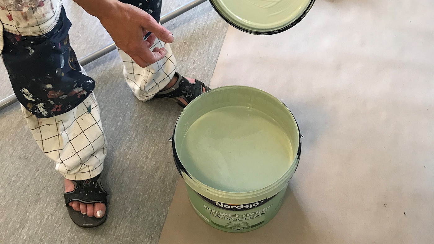 Ann-Charlotte Linde, Nordsjös kulörchef målar en av matsalsväggarna i den pistagegröna Misty Fontaine.