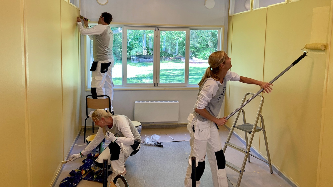 Jesper, Heli och Christine målar med den sommargula Nordsjö caramel crunch.