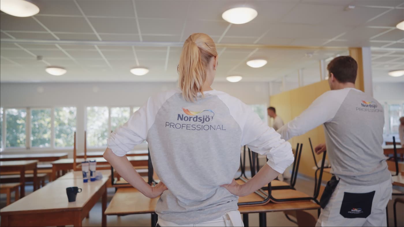 Färgen som vi målade väggarna med var vår Svanenmärkta väggfärg Nordsjö Perform+ Easy2Clean. Det är en perfekt produkt att använda i en matsal då den både är tvättbar och enkel att rengöra.