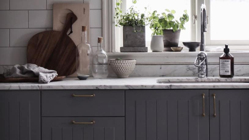 "Sen vi flyttade har jag verkligen blivit ett fan av billig och snabb uppfräschning. Färg kan verkligen göra susen och liva upp gamla möbler och rum som ingenting annat. Här i köket har jag målat med Nordsjös snickerifärg och färgkoden heter S 4500-N. De är en mörkgrå kulör som verkligen fick det här köket att komma till sin rätt!"