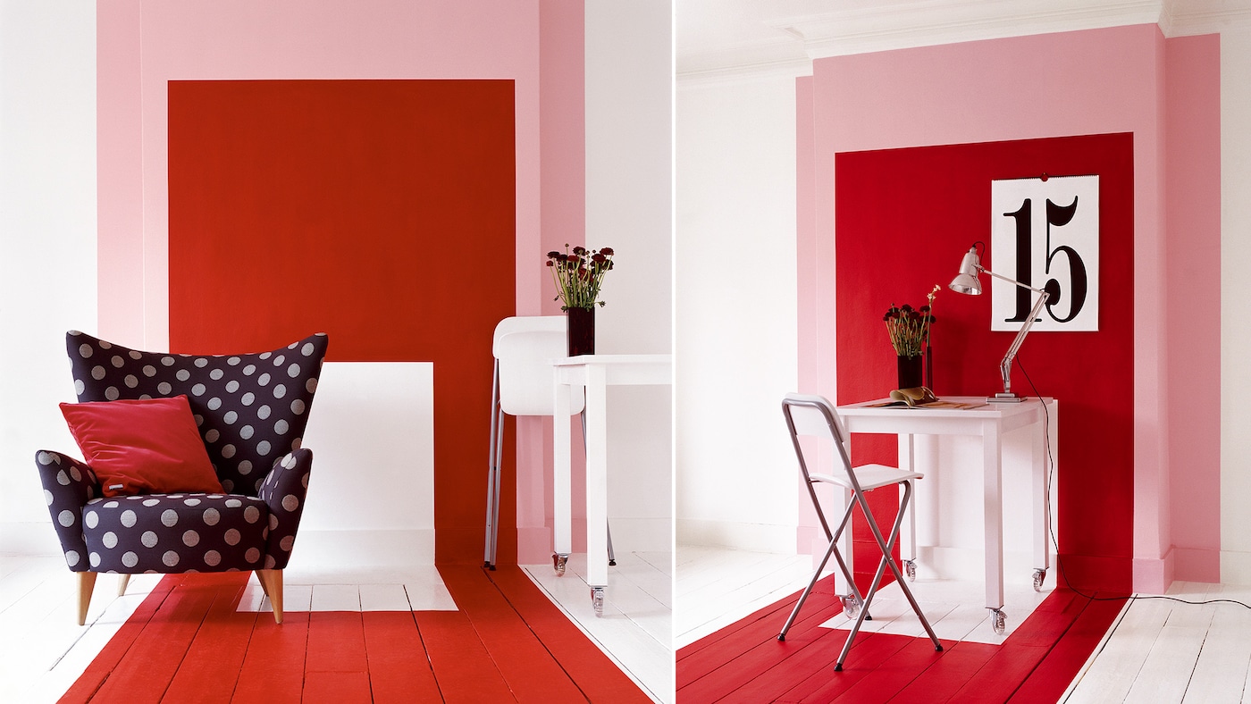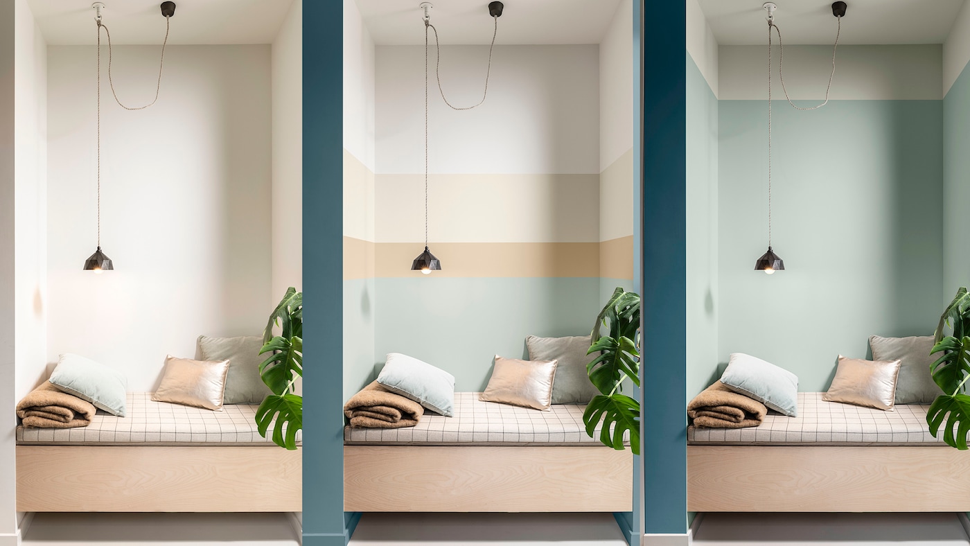 Här ser ni exempel på hur ett rum kan upplevas helt annorlunda beroende på var man väljer att måla fondväggen.