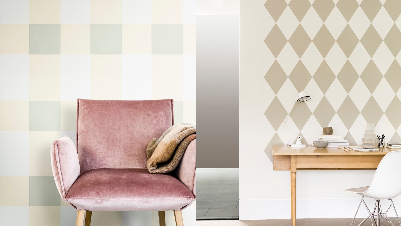 Här nedan har vi valt att måla med dekorativa rutor och diamanter. Såhär enkelt skapar du rutor eller diamanter på dina väggar. Klicka här för vår enkla guide.