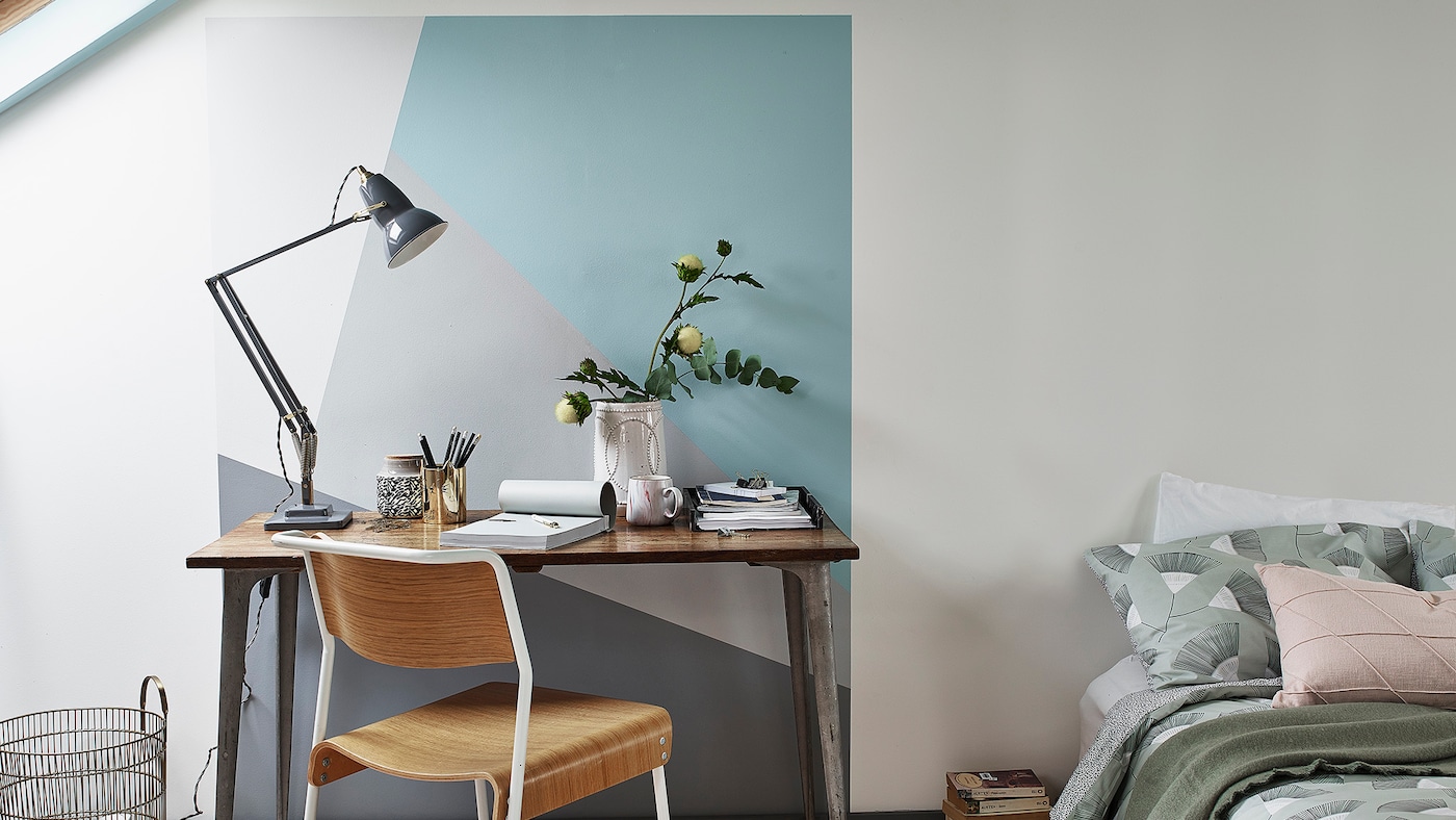 Sovrummet nedan behövde en yta för ett hemmakontor så här valde vi att måla dekorativa trianglar anpassade efter skrivbordets mått. Vi har målat med de vackra kulörerna Glowing Calais, P7.08.76, ON.01.87, RN.01.61 och NN.00.76.