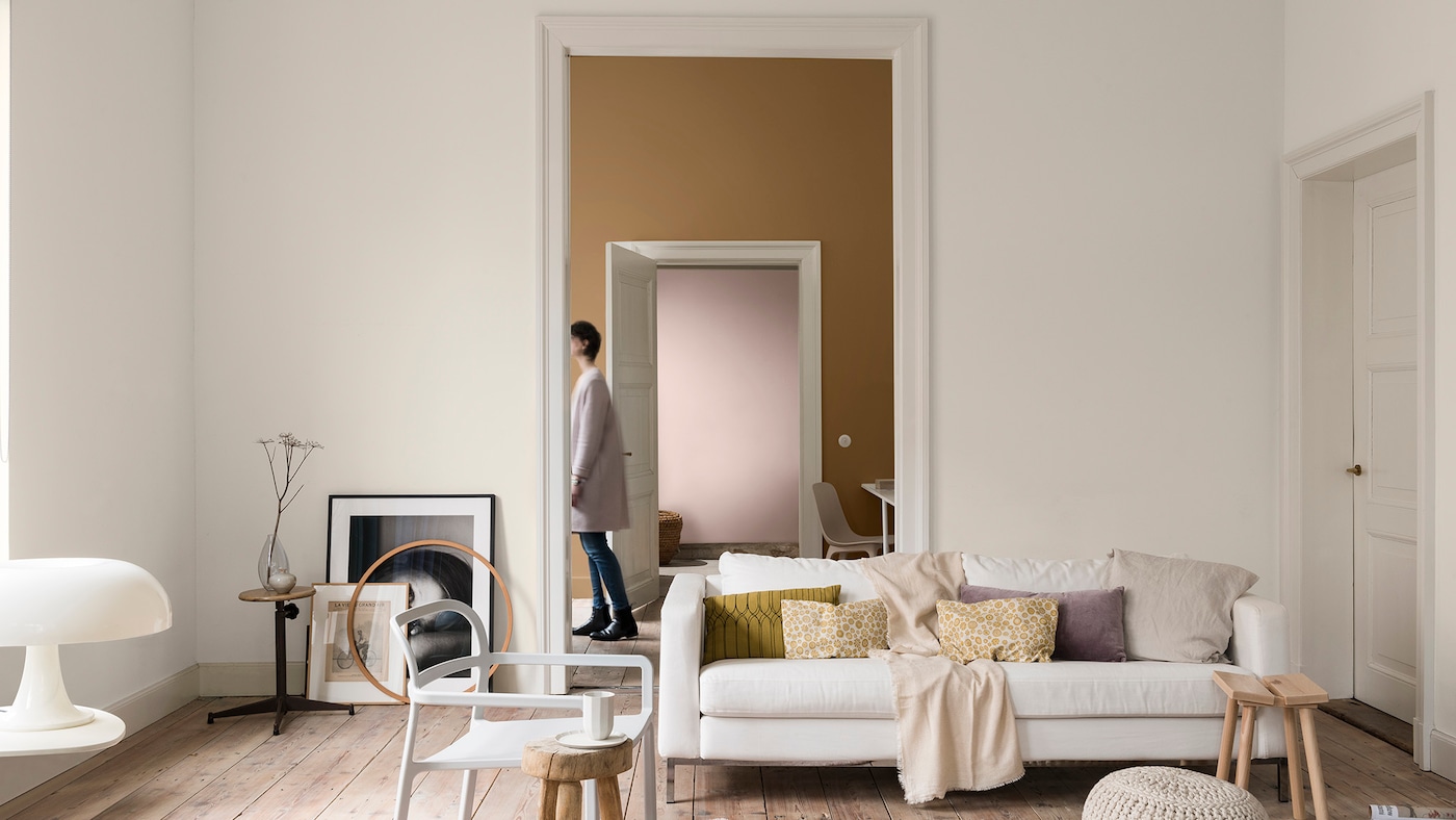 Extra dekorativt och effektfullt blir det med en fondvägg om du har flera rum som ligger i fil. Här har vi målat med kulören Spiced Honey och fondväggen längst in med Heart Wood.