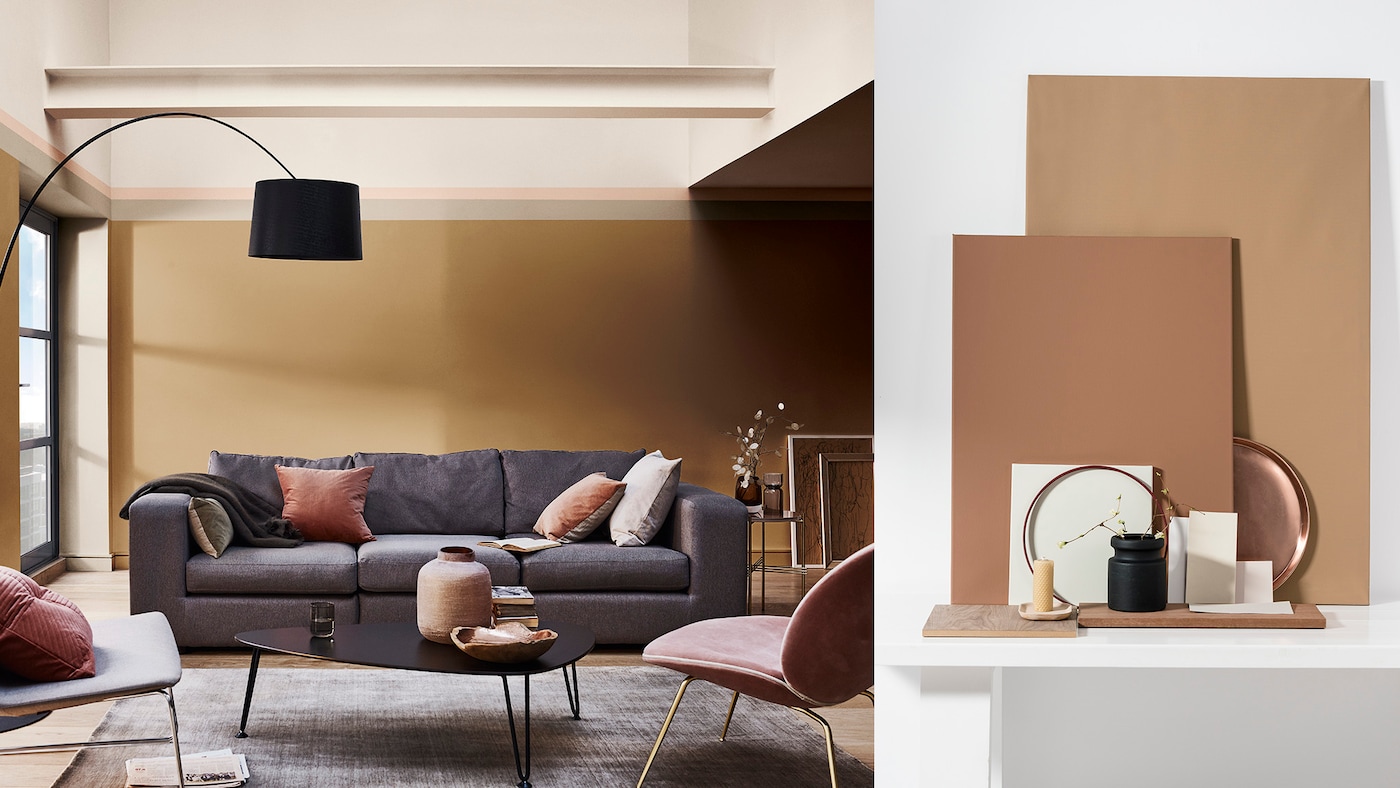Detaljer i dämpade grårosa kulörer och rustik lera är vackert att kombinera med den varma paletten på väggarna.