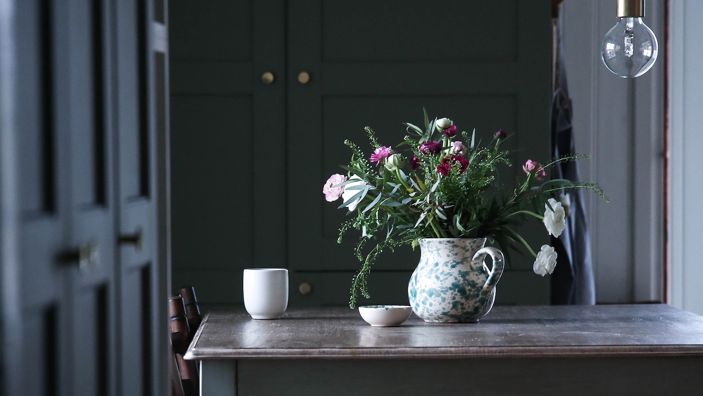 - Det viktigaste, för att det inte ska kännas plottrigt, är att alltid tänka på helheten. Ofta använder jag kulörer som ligger nära varandra i färgskalan och bryter sedan av med en eller två andra. Köksluckorna i köket och väggarna i sovrummet är målade i samma gröna kulör, men upplevs som olika beroende på glansskillnad och storleken på ytorna. Trots det så binder de ihop huset på ett fint och harmoniskt sätt.