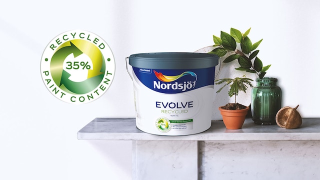 Nordsjö Evolve Recycled är tillverkad med 35% återvunnen färg. Den ger en fantastiskt fin och helmatt finish på väggar och tak, och är både en grund- och toppfärg i ett. Kort och gott, riktigt bra färg med ett lägre klimatavtryck.